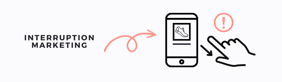 - Interruption marketing- You were scrolling on your phone when a sponsored post for a new running shoe brand showed up on your feed. You weren’t looking for running shoes, but now that you see them, you’re interested. This is referred to as interruptive marketing. You don’t need the product, but now that you know it exists, you want to learn more.